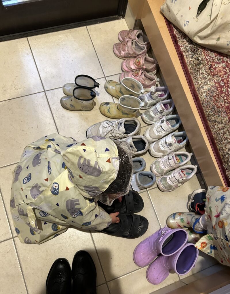 末っ子の長男は、みんなの靴を揃える係。 一人玄関にしゃがみ込み、小さな手で一生懸命に靴の向きをトントンと揃える。 その健気な姿は、家族みんなを笑顔にしてくれる、立派な「お仕事」です。